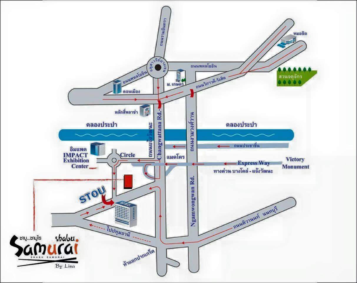 ถ้ามาจากไอทีฯ เข้าแจ้งวัฒนะ ผ่านศูนย์ราชการ ลอดใต้ทางด่วน เลี้ยวขวาเข้าเมืองทอง, มสธ. ร้านอยู่ขวามือ ก่อนถึงมสธ.เล็กน้อย...